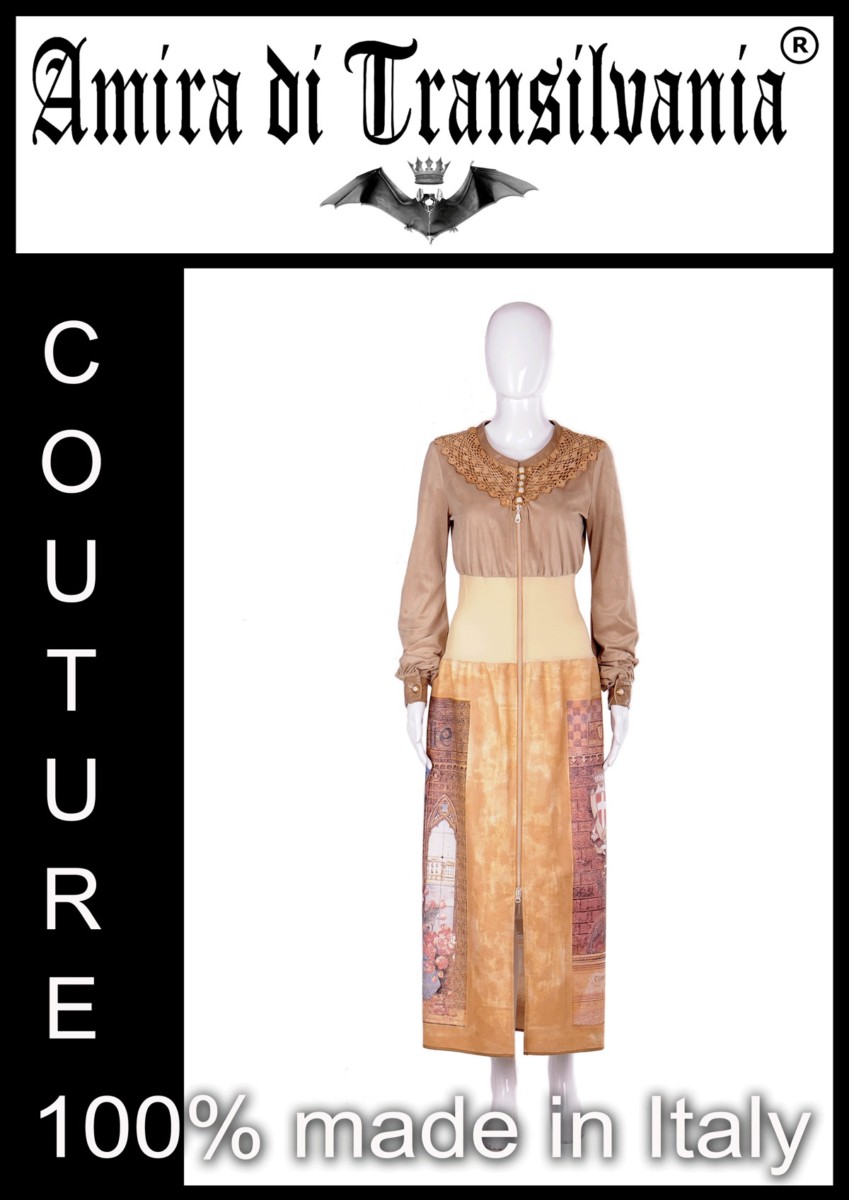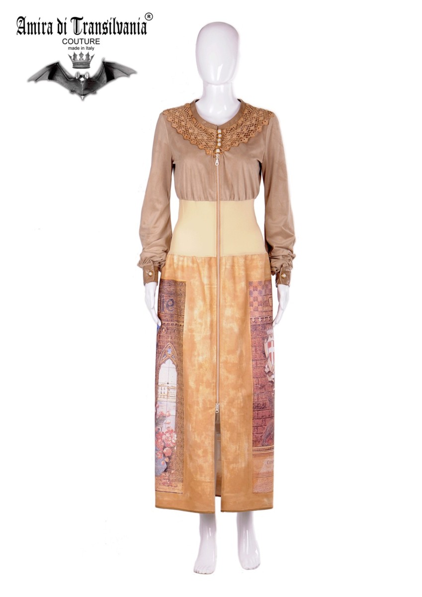 Abito couture beige in alcantara e macramè con stampa veneziana