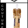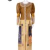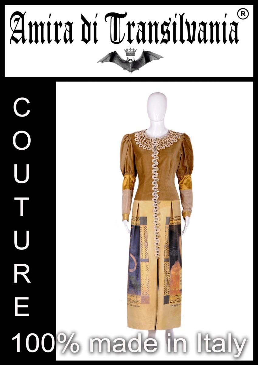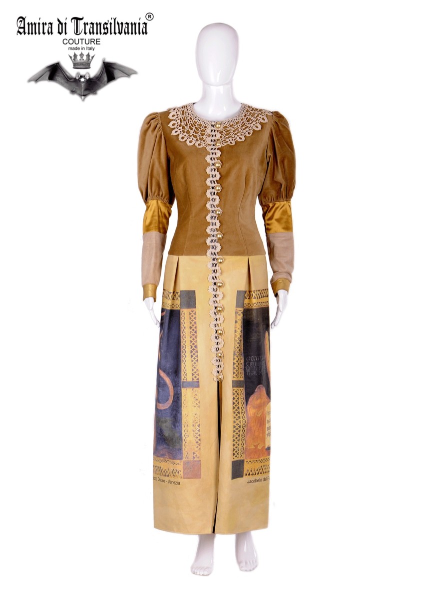 Collo in macramè e bottoni in ottone. Petto e maniche in velluto. Gonna stampata con stampa veneziana ”leone di venezia”.