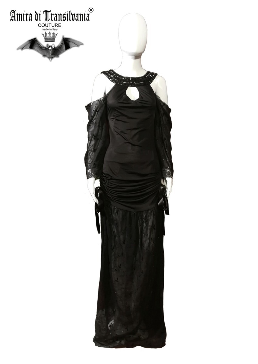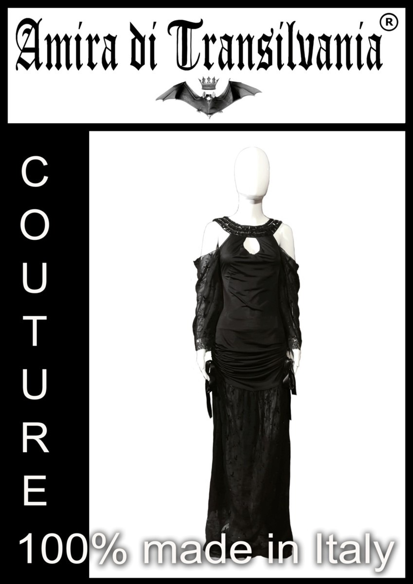 Abito minimal e sobrio in pizzo e lycra, con prezioso rocamo di pietre quadrate, con manica ampia adatto a tutte le occasioni importante e cerimoniali.
