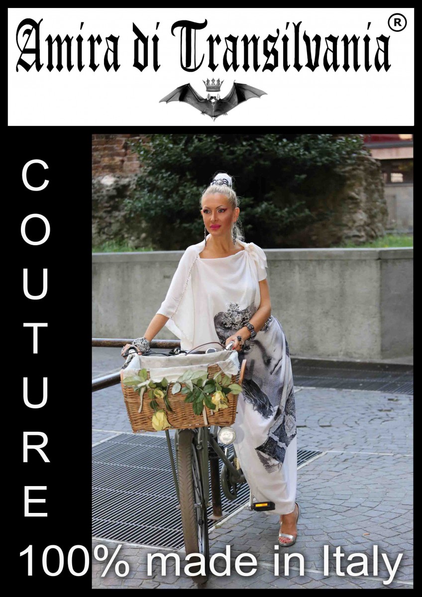 Lussuoso abito couture colore bianco stampa Piero della Francesca, in seta con stampa e ricamo con pietre e strass. Qualità sartoriale.