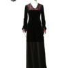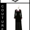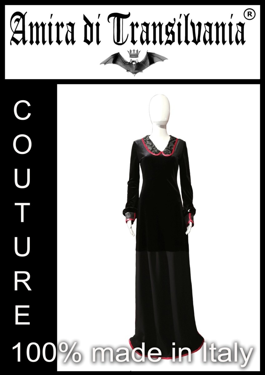Abito minimal e sobrio in velluto . Collo e polsi e collo in brocart rifinito a sbieco nero.