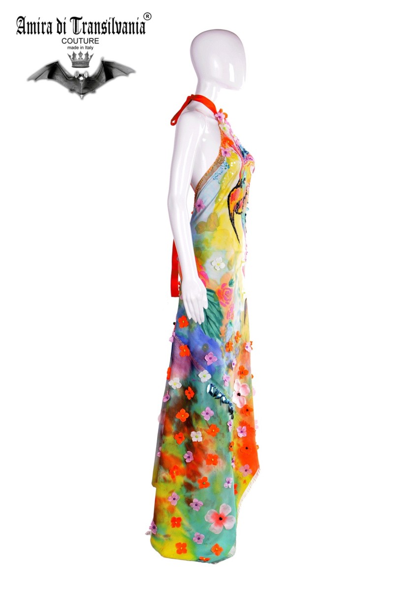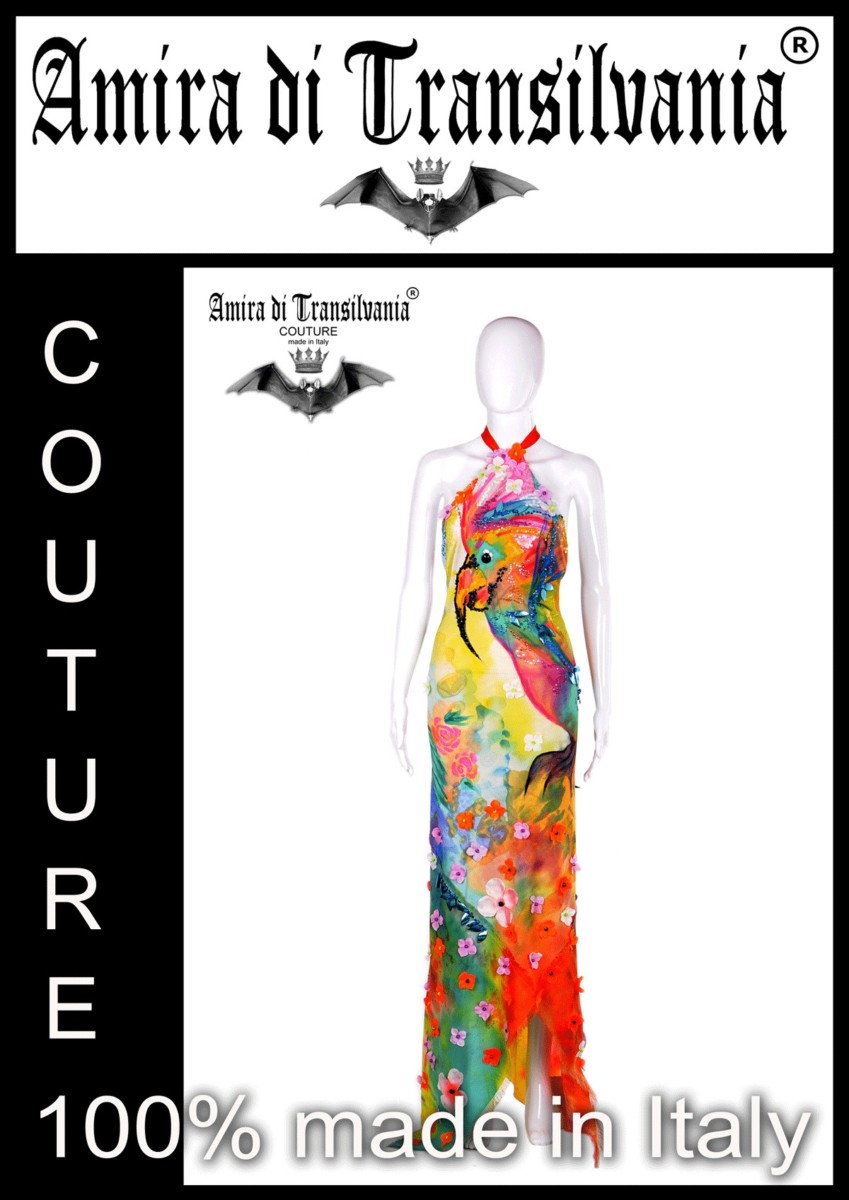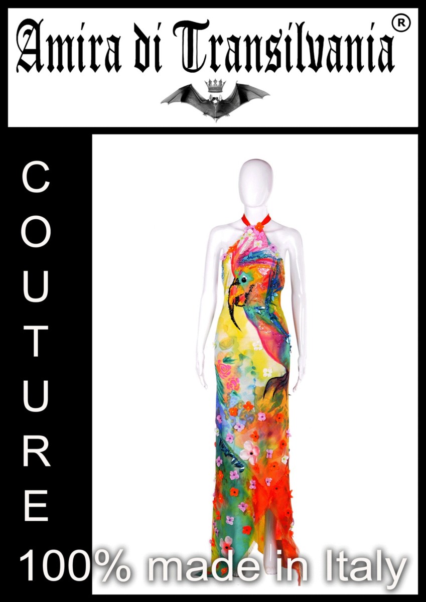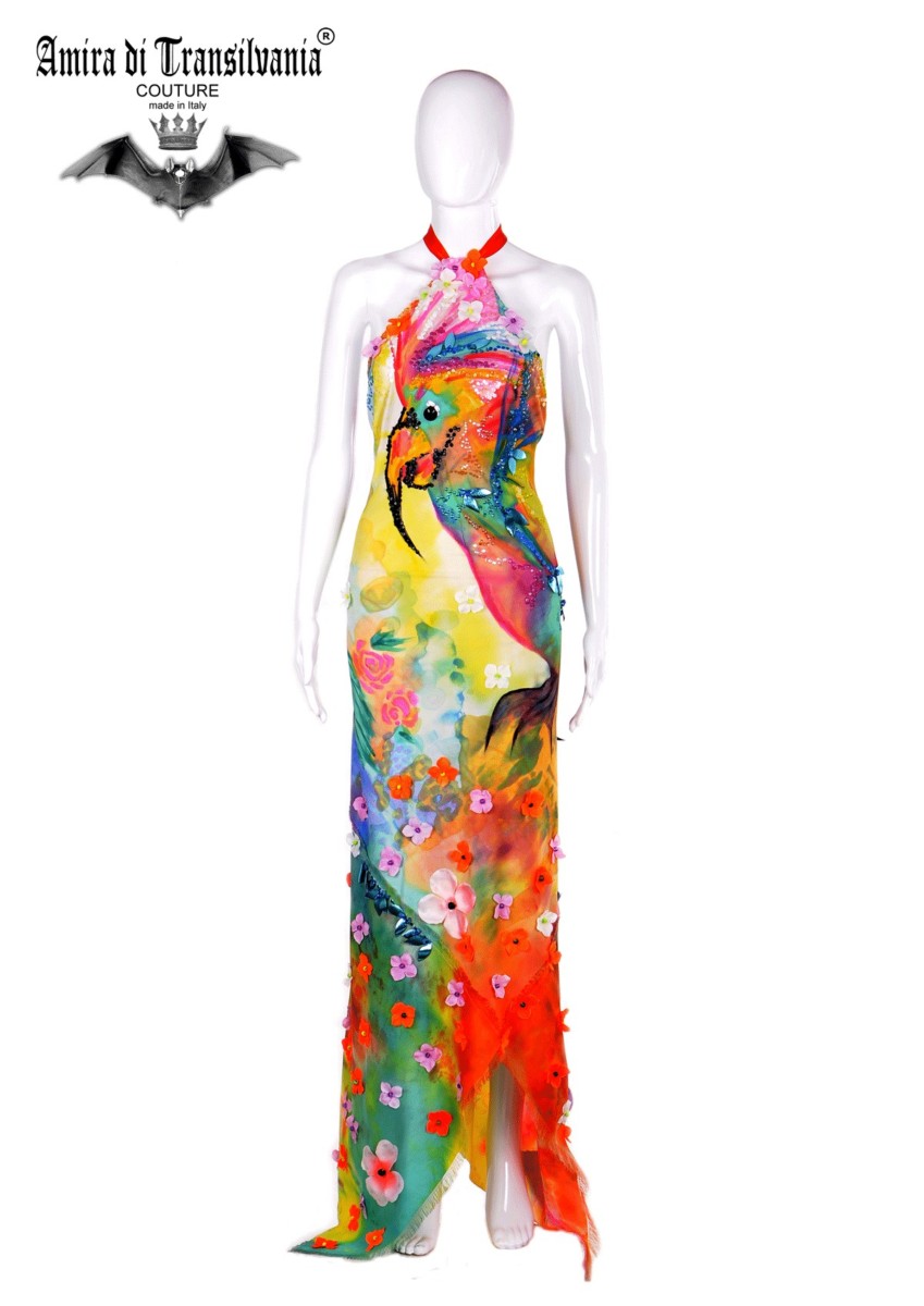 Lussuoso abito couture multicolors dipinto a mano con disegno pappagallo.