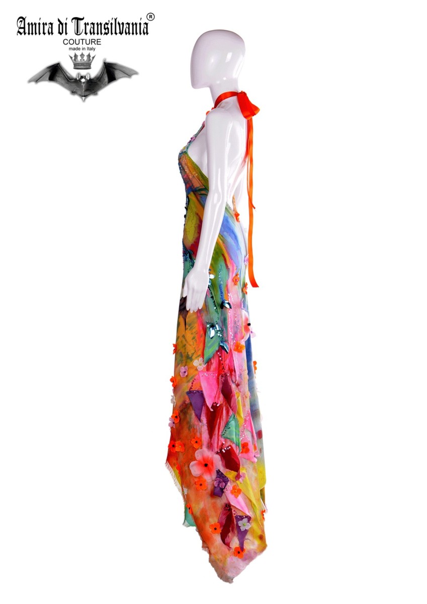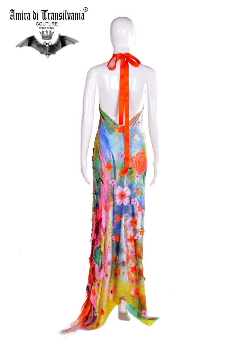 Abito Couture in raso di seta (sotto) e lycra (sopra) .Dipinto a mano e ricamato a mano con fiori in organza, petali, perline, paillette e strass, chiusura dietro con nastri di raso, e rifiniture a taglio vivo.
