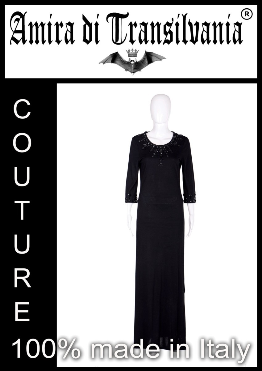 Classico e minimal,  Abito couture nero con ricamo manuale di perline e strass.
