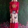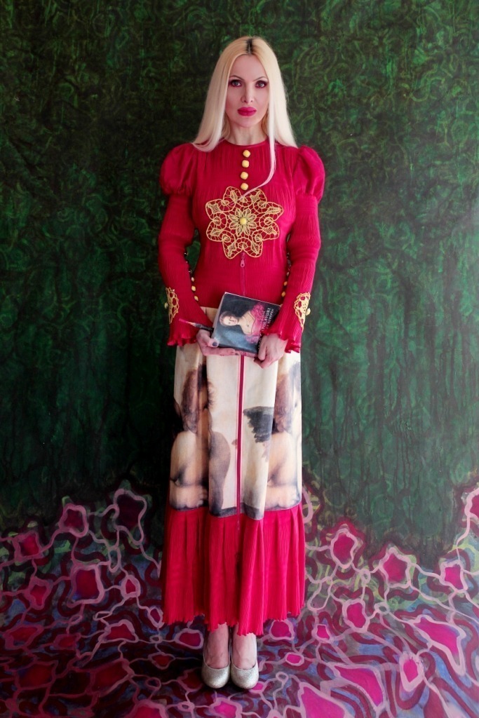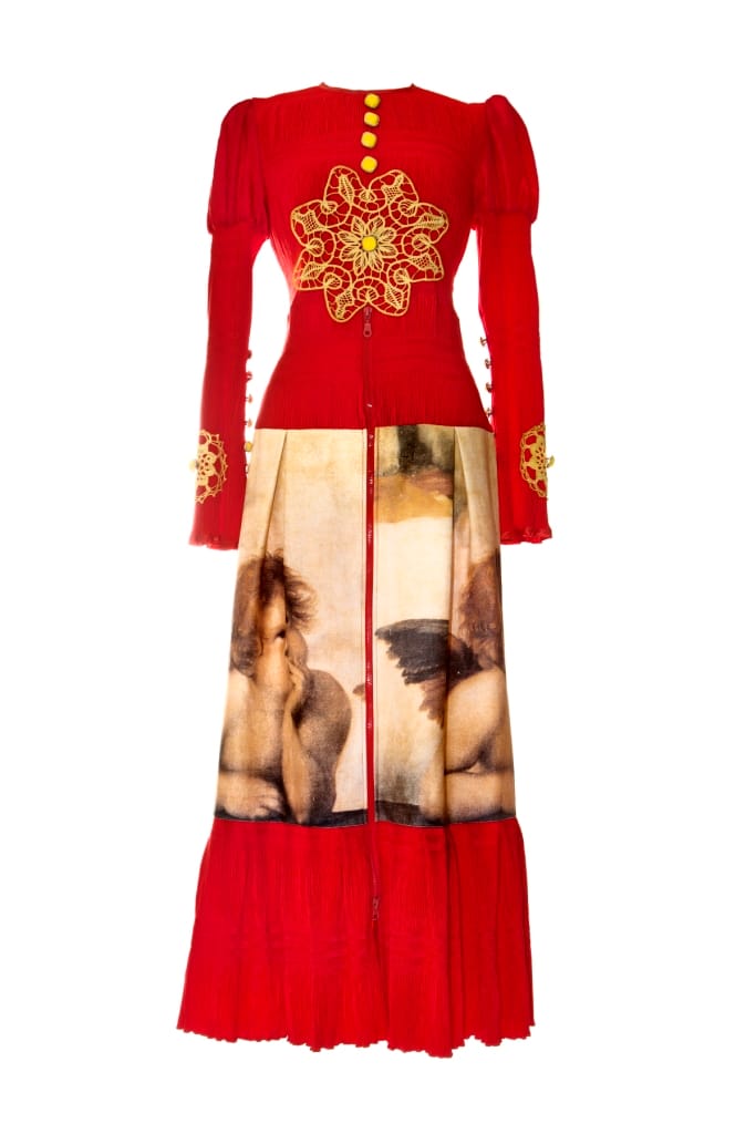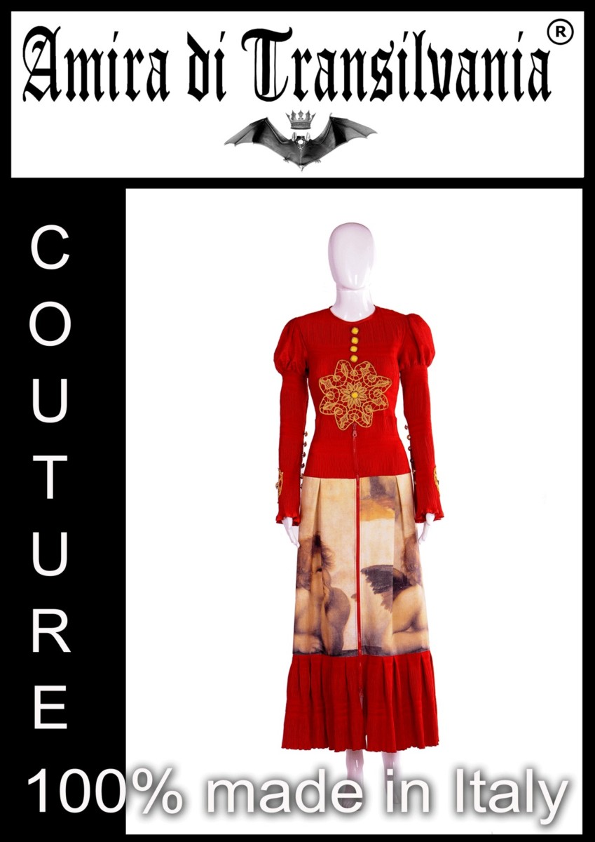 Lussuoso abito couture rosso con angeli, qualità sartoriale in crepe plissè di seta , cottone stampato con la stampa originale ”Putti di Raffaello”. Arricchito con macramè manuale dipinto a mano e bottoni intarsiati dello stesso colore.