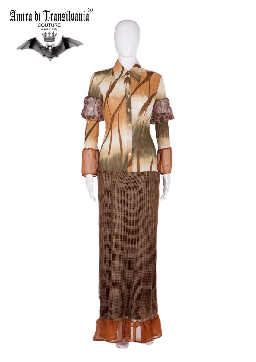 Eleganza classica per un abito couture stile chemise fantasia d’autunno . 100% made in Italy. Qualità sartoriale.
