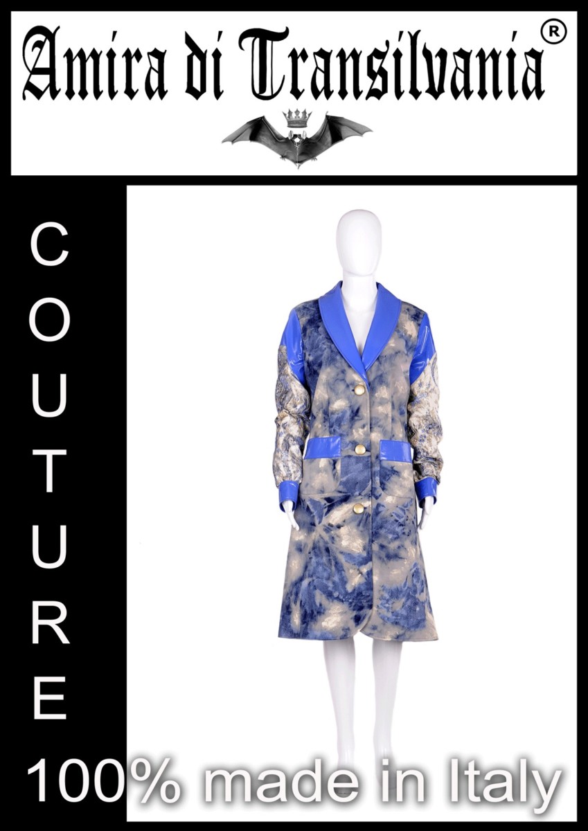 Cappotto blu jeans dipinto a mano con clori metalizzati effetto perla. Tessuto spesso in cottone di jeans e inserti di seta jacquard e vernice.