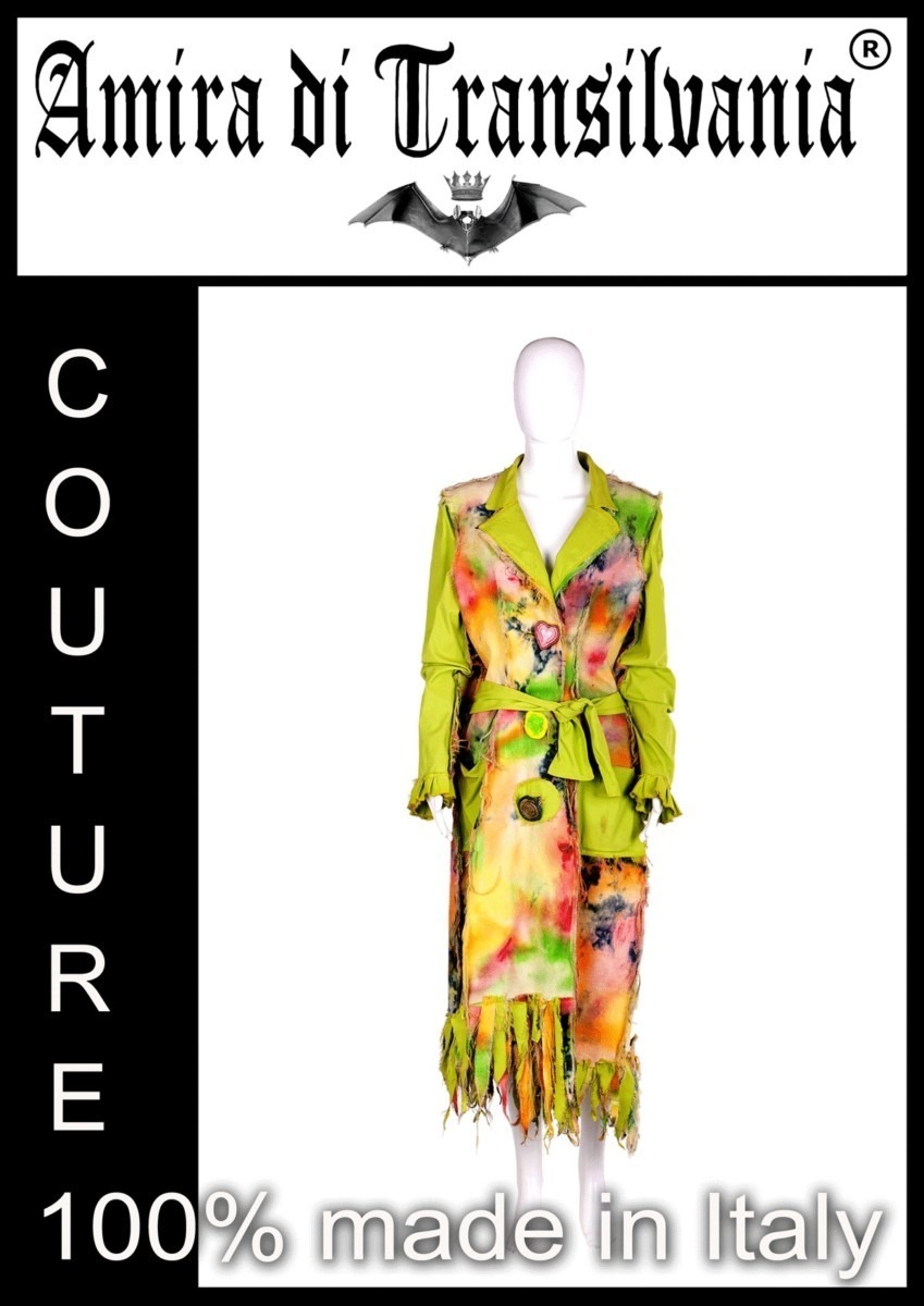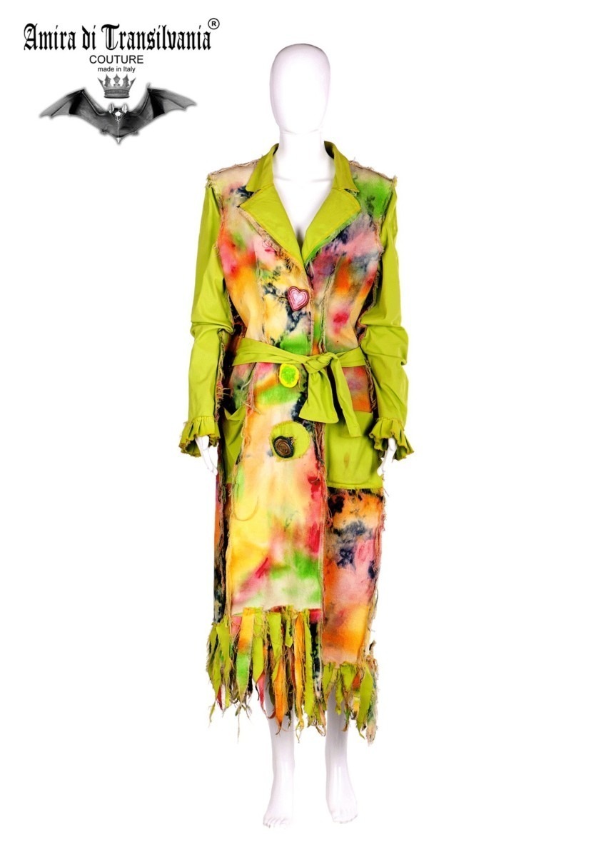 Ricamato e dipinto completamente a mano. Lavorazioni a taglio vivo. Con 3 bottoni in resina modellati a mano.