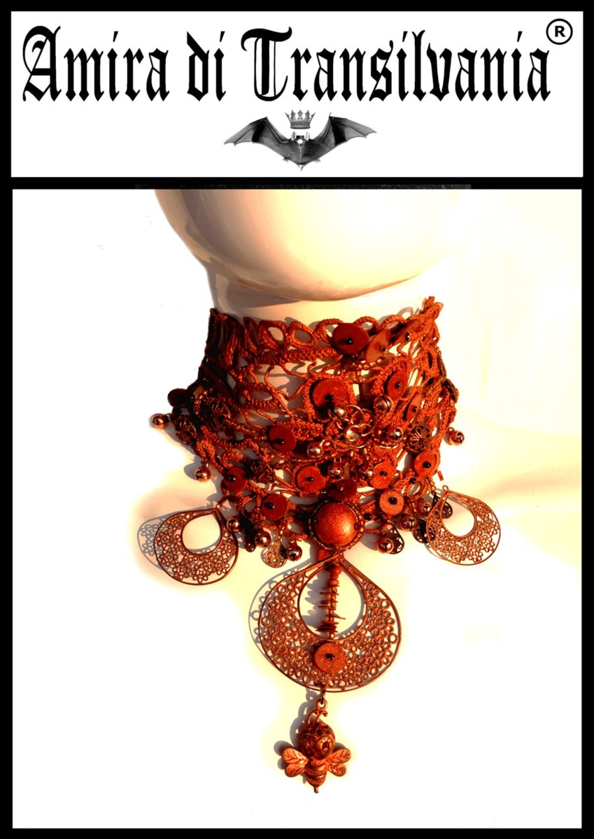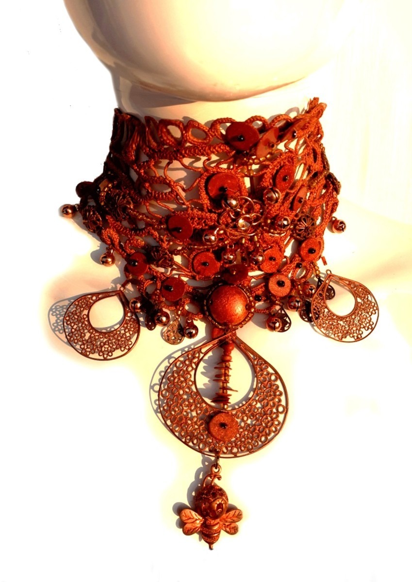Originalissmi collare rame macrame realizzato con la tecnica manuale originale dalla Transilvania, è un accessorio imponente e prezioso .