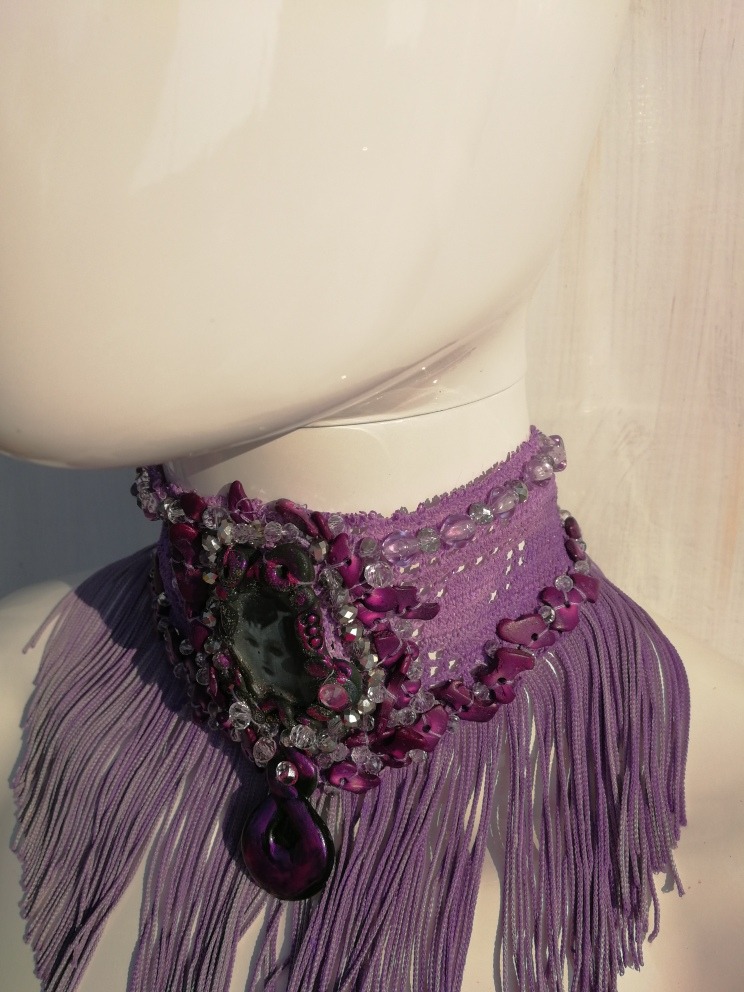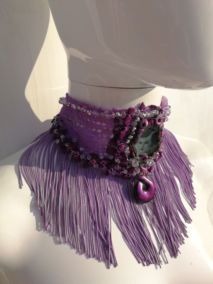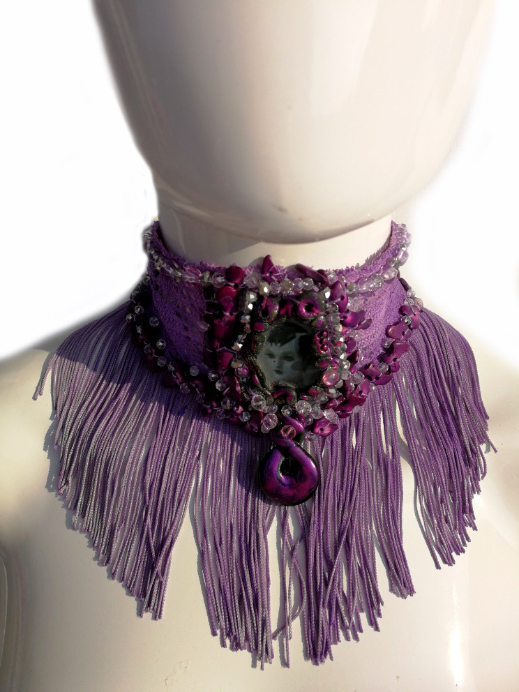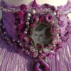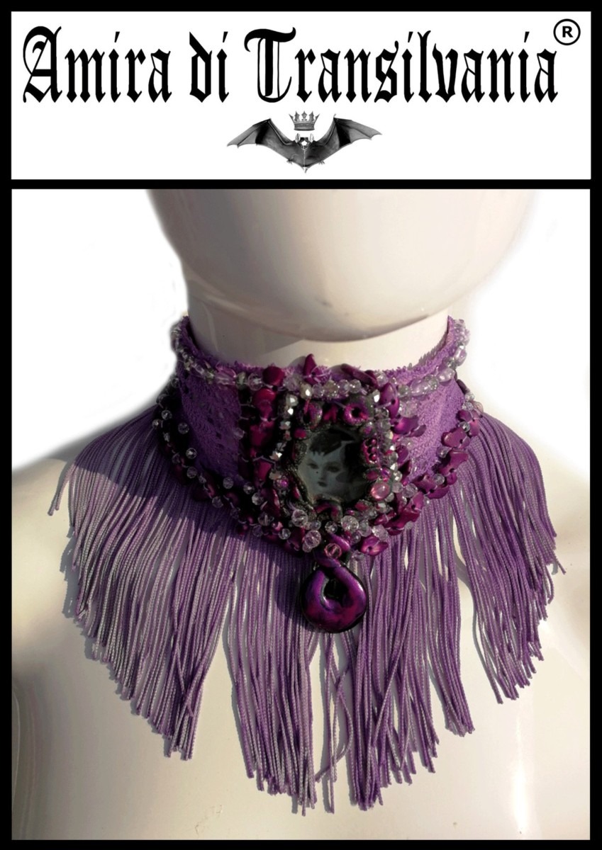 Accessorio unico, collare viola in macramè con cameo è realizzato con la tecnica manuale originale dalla Transilvania.