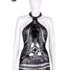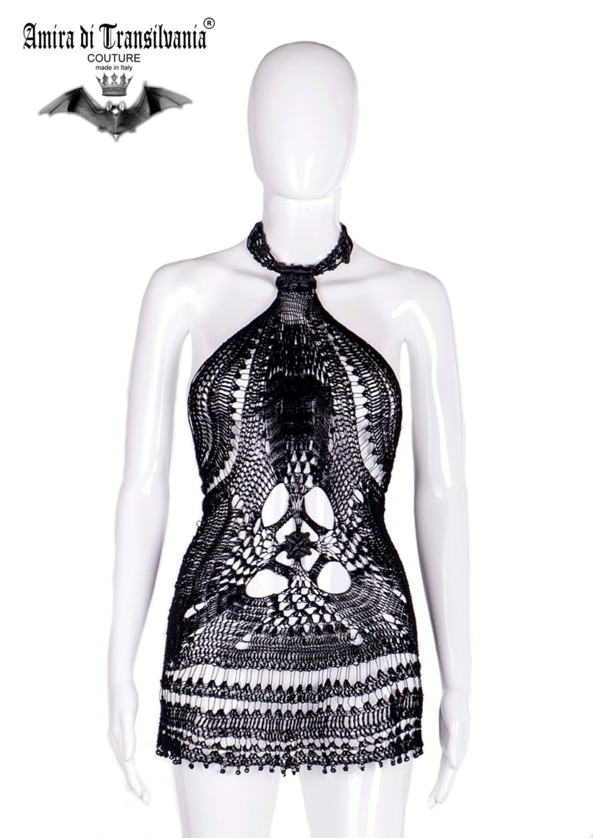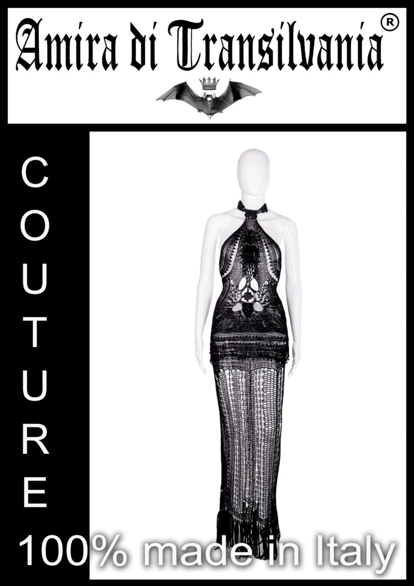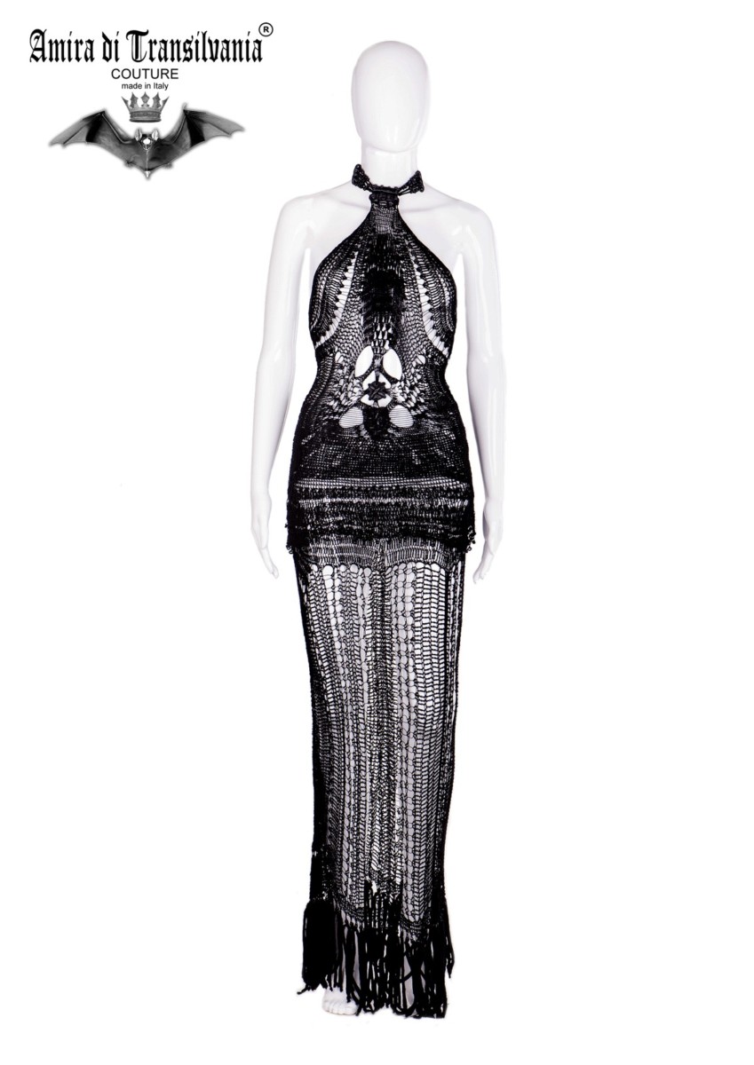 Completo nero ad uncinetto in filo di seta e cotone realizzato esclusivamente a mano in Italia. La lavorazione di un simile completo richiede circa 5 giorni di lavoro manuale.
