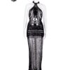 Composto da 2 pezzi : top e gonna con frange. Il top è giro collo con una collana gioiello in resina. Il top è rifinito con perline di resina.